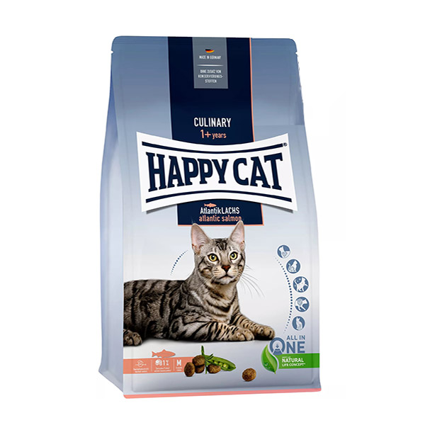 غذای خشک هپی کت ، با طعم ماهی سالمون اقیانوس اطلس تهیه شده است. این محصول به پیشگیری از تشکیل گلوله مویی در گربه و دفع آن کمک می کند.