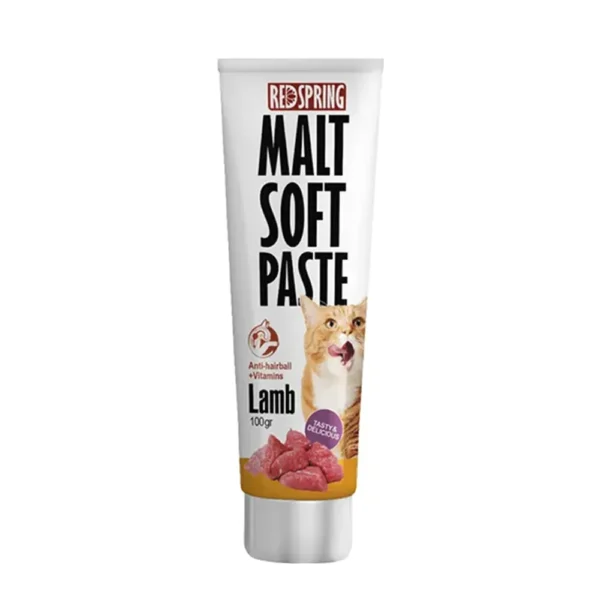 خمیر مالت گربه رد اسپرینگ با طعم بره Malt Soft Paste lamb تولید شده و حاوی سلولز می باشد که مانع از تشکیل گلوله مویی در دستگاه گوارش می شود.