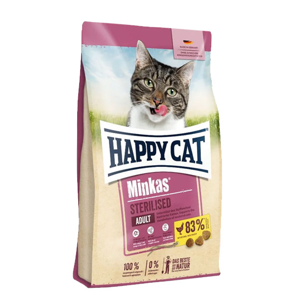 غذای هپی کت از سری مینکاس مدل استریلایزد برای گربه های بالغ عقیم شده با طعم طیور تولید شده است. این محصول غنی از اسیدهای چرب ضروری امگا 3 و 6 می باشد.