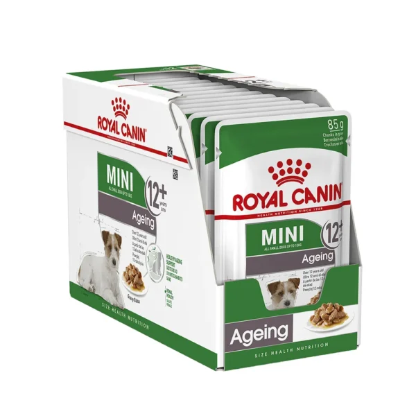 غذای پوچ مینی ایجینگ یا Mini Ageing سگ مسن نژاد کوچک رویال کنین به صورت خورشتی از سن 12 سالگی قابل استفاده است و به بهبود سلامت عمومی کمک می کند.