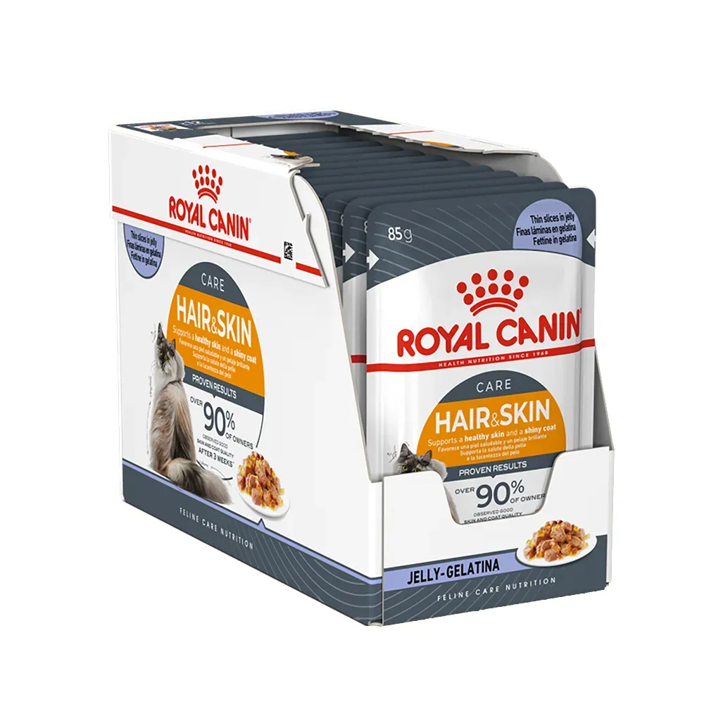 پوچ ژله ای گربه هیر اند اسکین رویال کنین دارای کالری متعادل است تا موجب بروز اضافه وزن نشود. طعم آن ترکیبی از طعم گوشت و ماهی است که بسیار لذیذ می باشد. مقدار مواد معدنی آن به گونه ای تنظیم شده که به حفظ سلامت دستگاه ادراری کمک کند. در ترکیب این غذا پروتئین کافی برای حفظ سلامت و تقویت عضلات بدن وجود دارد. استفاده از این محصول همراه با غذای خشک هیر اند اسکین موجب اثرگذاری بهتر آن خواهد شد.