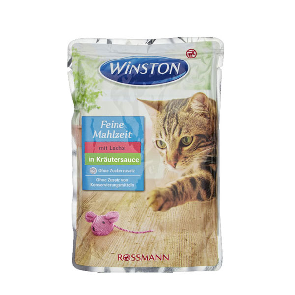 پوچ گربه وینستون با طعم ماهی سالمون در ژله گیاهی برای گربه های بالغ تولید شده؛ غنی از تورین و بیوتین و فاقد قند، رنگ و مواد نگهدارنده است.