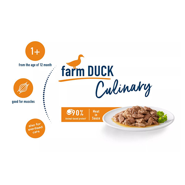 این محصول برای گربه های بالغ تمامی نژادها با سن بالای 1 سال تولید شده است. در ترکیب آن از گوشت اردک که همراه با سس مخصوص پخته شده استفاده شده و طعمی بسیار عالی دارد. این غذا پروتئین بالایی دارد و به تقویت عضلات کمک می کند. به همین دلیل برای گربه های عقیم شده بسیار مناسب است. فرمولاسیون این غذا بسیار کامل بوده و به عنوان غذای اصلی قابل استفاده است.