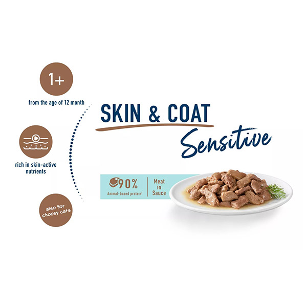 این محصول برای گربه های بالغ همه نژادها با سن بالای 1 سال که به حساسیت های پوستی مبتلا هستند، تولید شده است. در ترکیب آن از گوشت مرغ با کیفیت استفاده شده که در سس مخصوص قرار گرفته و طعمی عالی دارد. همچنین برای تامین اسیدهای چرب ضروری امگا 3 و 6، حاوی ماهی سالمون است. این اسیدهای چرب و مواد فعال موجود در این پوچ به بازسازی و تقویت پوست و مو کمک می کنند. استفاده منظم از این پوچ موجب تقویت پوست و مو، افزایش سلامت، زیبایی و براق شدن موها خواهد شد.