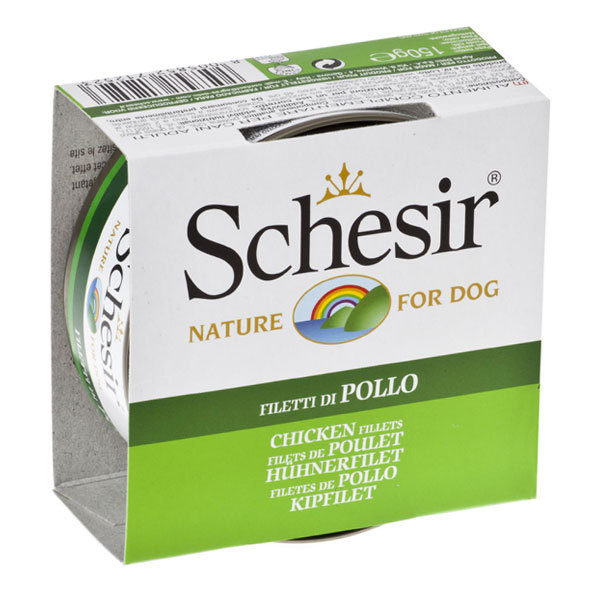 کنسرو سگ با فیله مرغ شسیر یا Schesir Chicken fillets به صورت ژله ای عرضه می شود. این محصول با کیفیت به صورت بخارپز تولید شده است.