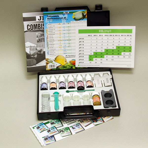 کیف تست جی بی ال با نام کومبی ست JBL Test Combi Set plus Fe همراه با تست آهن عرضه شده که یکی از کاربردی ترین کیت های ست آب آکواریوم می باشد. مقیاس های سختی و ارزش آب به ماهی و گیاهان آکواریوم بستگی دارد. حتی اگر آب به نظر زلال باشد، احتمال آلودگی وجود دارد. با آب نامناسب، بیماری ها یا جلبک ها ممکن است در آکواریوم ظاهر شوند. برای حفظ سلامت آکواریوم با ایجاد شرایطی مشابه با طبیعت، مهم است که مرتبا بررسی و تنظیم مقادیر آب را انجام دهید. با مجموعه کومبی ست با تست آهن JBL Combi Combo شما می توانید 9 مشخصه ی مهم آب در آکواریوم خود را تعیین کنید.