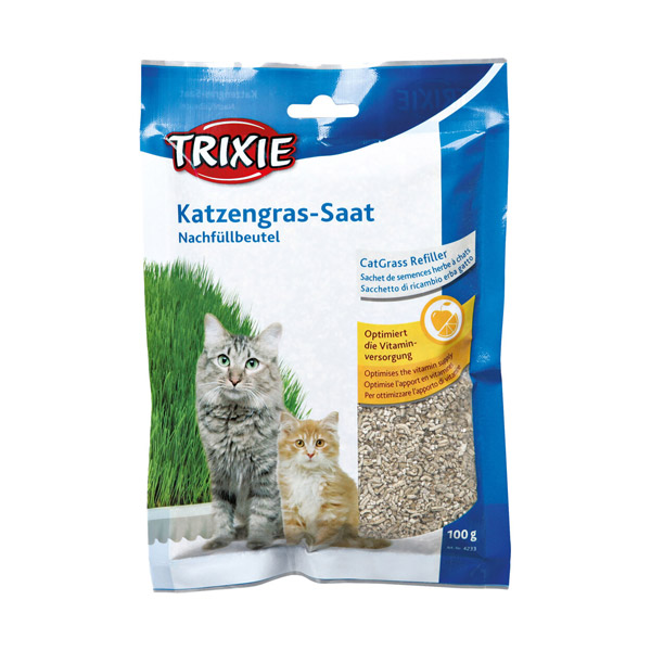 بذر علف تریکسی برای گربه ها تولید شده است. این محصول بعد از 3 روز شروع به رشد کرده و هنگامی که ارتفاع آن به 4 الی 5 سانتی متر برسد قابل استفاده است.