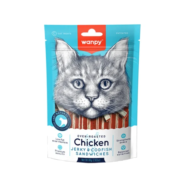 تشویقی ساندویچی گربه ونپی Chicken & Codfish Sandwich با طعم مرغ و ماهی کاد سرشار از پروتئین و امگا 3 است و پوست و مو را تقویت می کند.