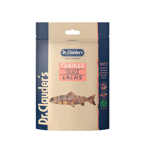 تشویقی دکتر کلادرز با طعم سالمون Trainee Snack Salmon نوعی اسنک مکعبی برای همه سگ ها و گربه ها به صورت نیمه مرطوب و حاوی اینولین است.