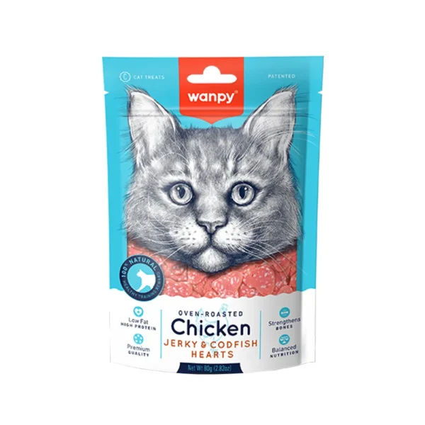 تشویقی ونپی با طعم مرغ و ماهی کاد Chicken Jerky & Codfish Heart به صورت قلبی شکل برای گربه های تمامی نژادها با سن بالای 3 ماه تولید شده است.