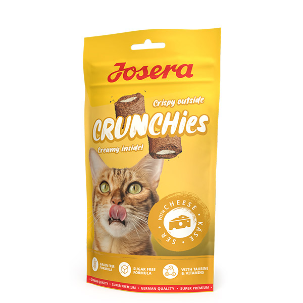 تشویقی کرانچی مغزدار جوسرا با طعم پنیر Crunchies with Cheese برای گربه های بالغ با فرمولاسیون فاقد غلات و به صورت کم کالری تولید شده است.