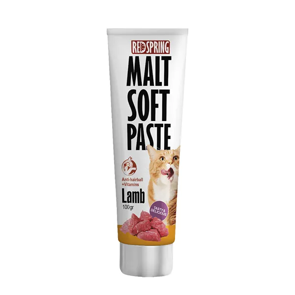 خمیر مالت گربه رد اسپرینگ با طعم بره Malt Soft Paste lamb تولید شده و حاوی سلولز می باشد که مانع از تشکیل گلوله مویی در دستگاه گوارش می شود.