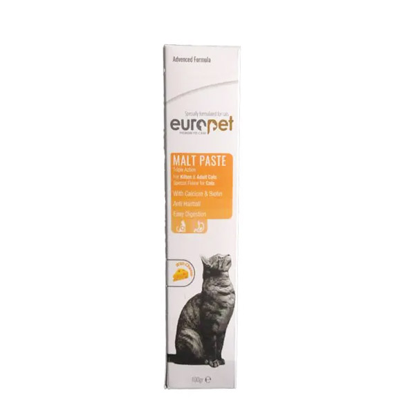 خمیر مالت یوروپت محصولی 3 گانه برای گربه ها در همه سنین با طعم پنیر است. این محصول حاوی کلسیم، سدیم و بیوتین بوده و فاقد قند افزوده و مواد مضر می باشد.