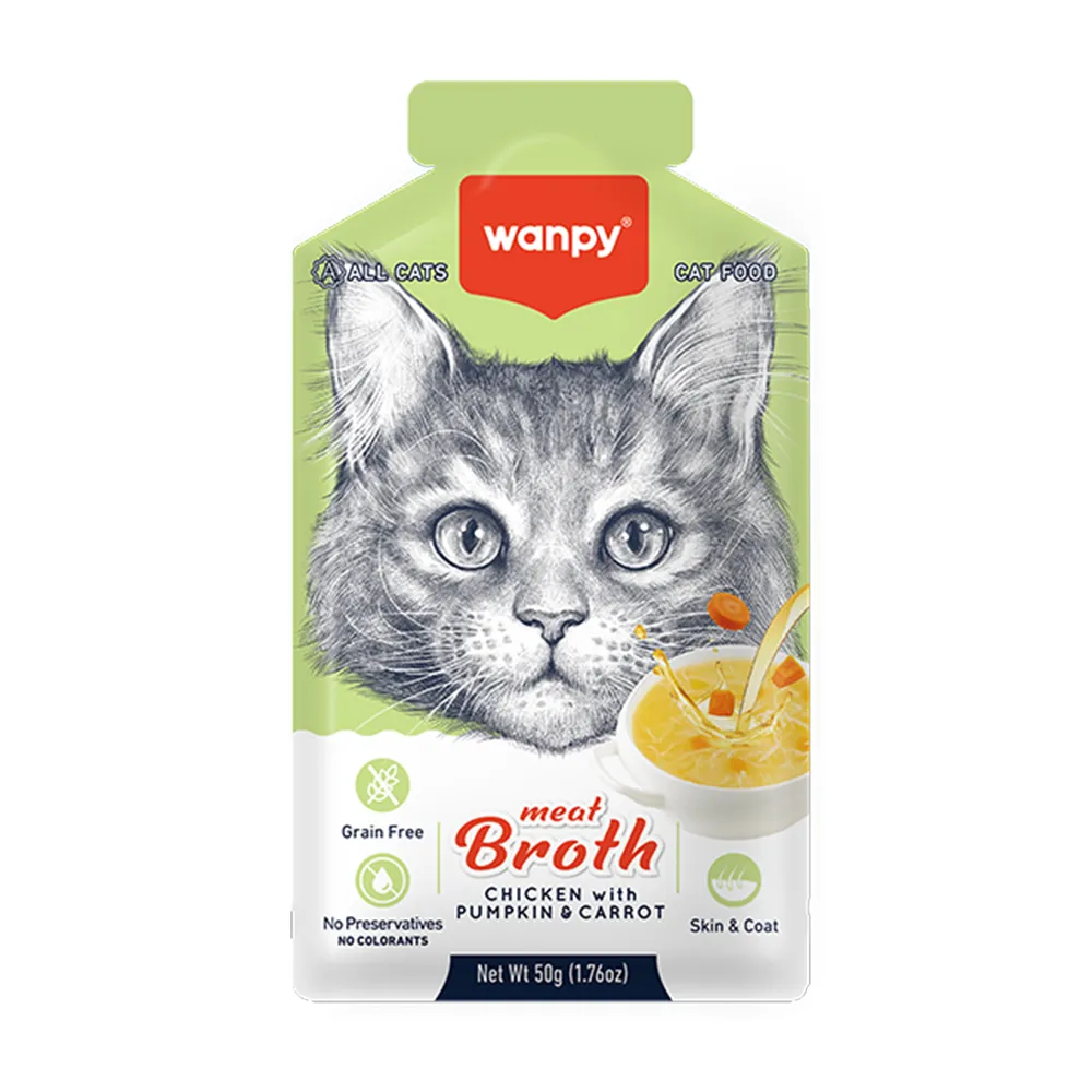 ونپی این سوپ گربه را با طعم مرغ و کدو و هویج Meat Broth Chicken تولید کرده است. این محصول سرشار از مواد مغذی بوده و رطوبت بالایی دارد.