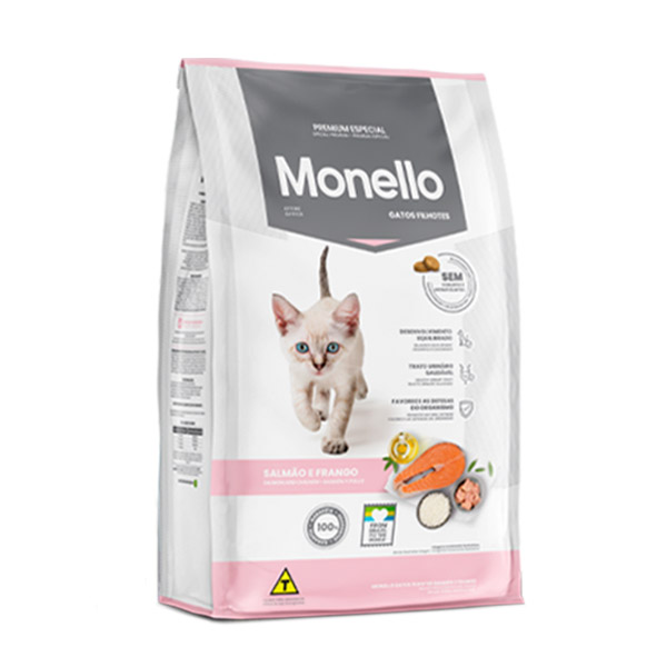 غذای مونلو برای بچه گربه های همه نژادها با طعم مرغ و سالمون تولید شده است. این محصول حاوی مخمر و روغن ماهی برای تقویت پوست و مو می باشد.