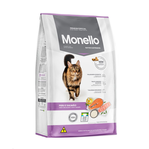 غذای مونلو با طعم بوقلمون و ماهی سالمون برای گربه های عقیم شده با سن بالای 12 ماه تولید شده و دارای کالری کنترل شده و فیبر کافی است.