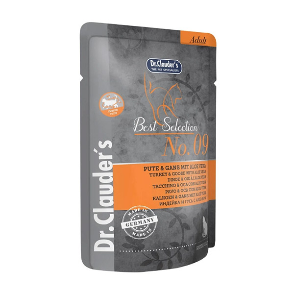 پوچ گربه دکتر کلادرز با طعم بوقلمون و غاز و آلوئه ورا Turkey & Goose را می توان برای همه نژادها به عنوان یک وعده اصلی غذایی مورد استفاده قرار داد.