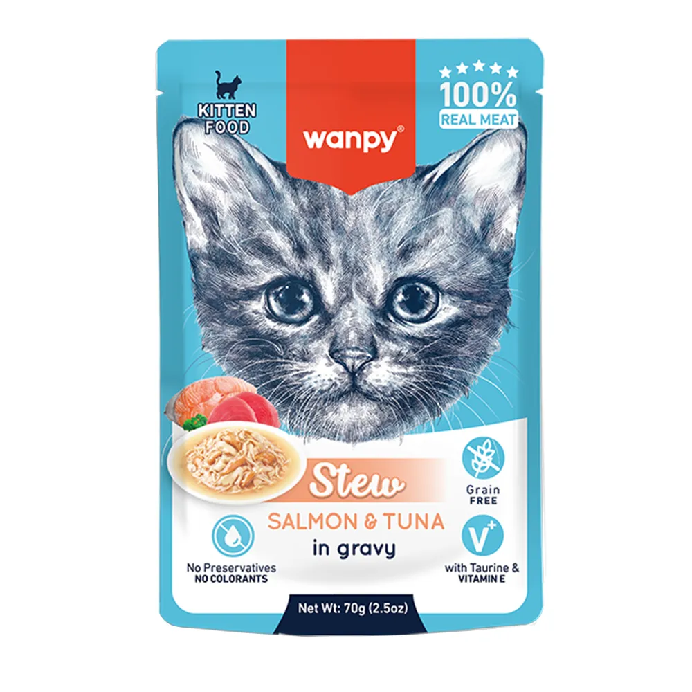 پوچ ونپی با طعم ماهی سالمون و تن Stew Salmon & Tuna به صورت خورشتی تولید شده و برای بچه گربه های تمامی نژادها در نظر گرفته شده است.