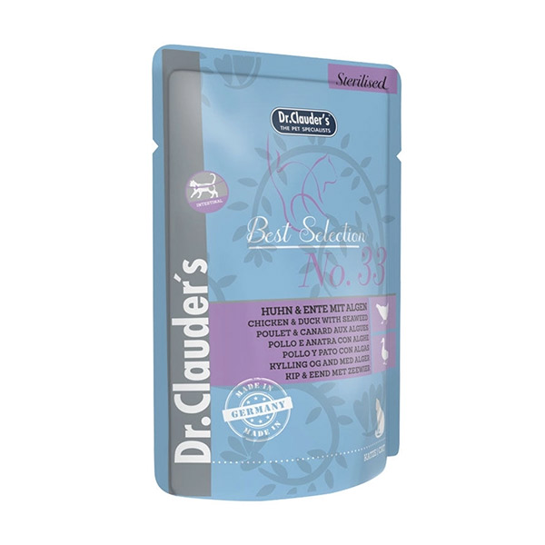 پوچ گربه عقیم شده دکتر کلادرز با طعم مرغ و اردک Chicken & Duck یک وعده کامل غذایی حاوی جلبک بوده و کم کالری برای همه نژادها است.