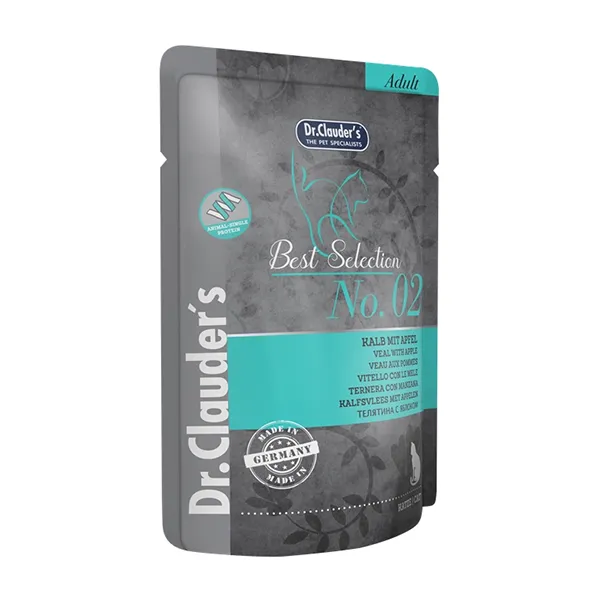 پوچ دکتر کلادرز با طعم گوشت گاو و سیب Veal With Apple یک وعده کامل غذایی سرشار از فیبر می باشد که برای گربه های بالغ تولید شده است.