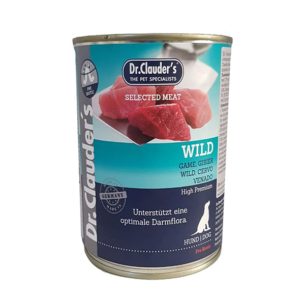 کنسرو سگ دکتر کلادرز با طعم گوشت شکاری Dr Clauder’s Wild سرشار از انواع پروتئین های حیوانی شامل ماهیچه، اردک و خوک با عطر و طعم بسیار لذیذ است.