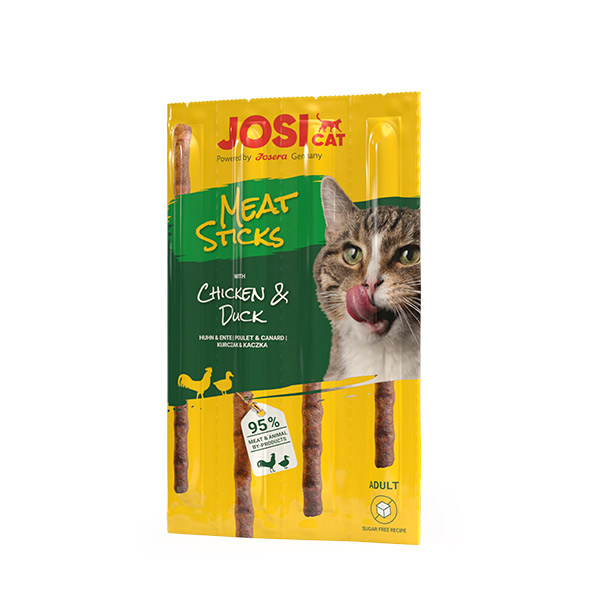 تشویقی مدادی جوسرا با طعم مرغ و اردک Chicken & Duck برای گربه های بالغ تولید شده و 95% از ترکیبات آن را گوشت و مشتقات حیوانی تشکیل داده است.